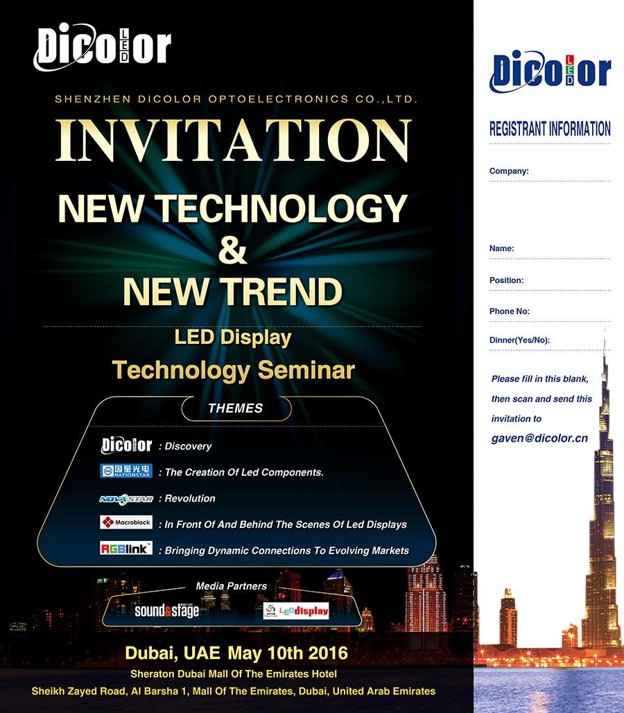 Когда Dicolor предложил идею семинара технологий светодиодных дисплеев в Дубае, план быстро получил положительный отклик со стороны многих известных предприятий и средств массовой информации. И в конце концов, Dicolor заключил соглашение с тайваньским Macroblock, Nationstar, RGBlink, Novastar и LED DISPLAY и получил сильную поддержку со стороны Sound & Stage, известный медиа компания в звуковой и сценической отрасли на Ближнем Востоке. Все соберутся в Отеле «Шератон» (Дубай), будут дискуссии о инновациях и тенденциях светодиодных технологий с присутствием более чем 200 отраслевых экспертов и профессиональных клиентов из стран Ближнего Востока, которые оставят свой голос в мировой революции новейших технологий светодиодных дисплеев.